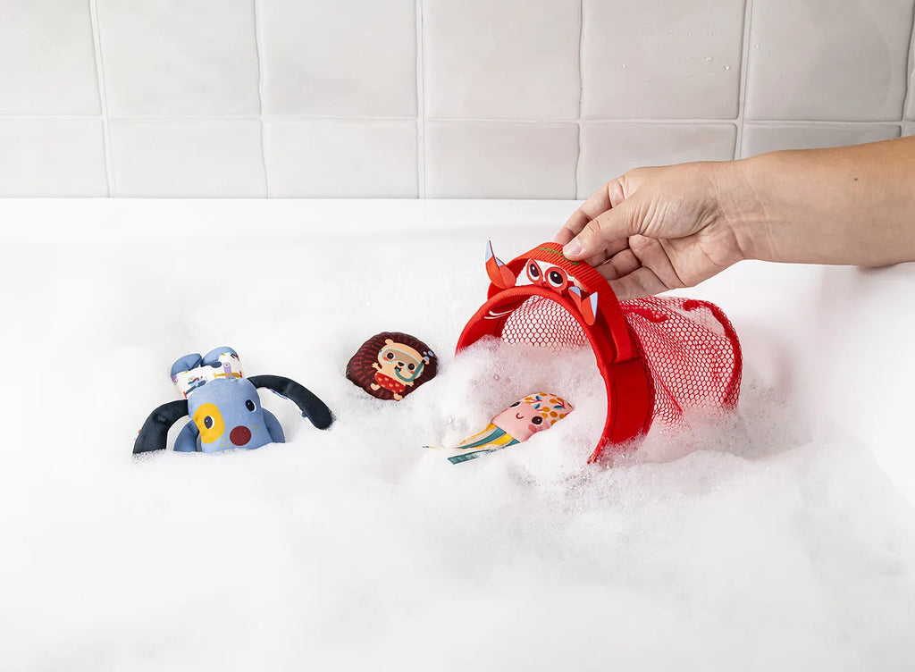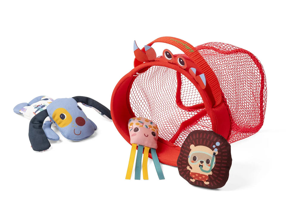 Ova šarena igračka za kupanje prikladna je za decu od 12 meseci. Sastoji se od mrežice s motivom crvenog raka i tri plutajuće figurice (pas Jules, jež Léon i ružičasta meduza). Odlična je za zabavu tokom kupanja, ali i za podsticanje koordinacije i maštovitosti deteta. Praktična ručka mrežice omogućuje jednostavno držanje tokom igre, a ujedno služi i za vešanje igračke radi sušenja. Nakon svake upotrebe igračku isperite čistom vodom i osušite. Može se prati u masini na 30 °C, na osetljivom programu.