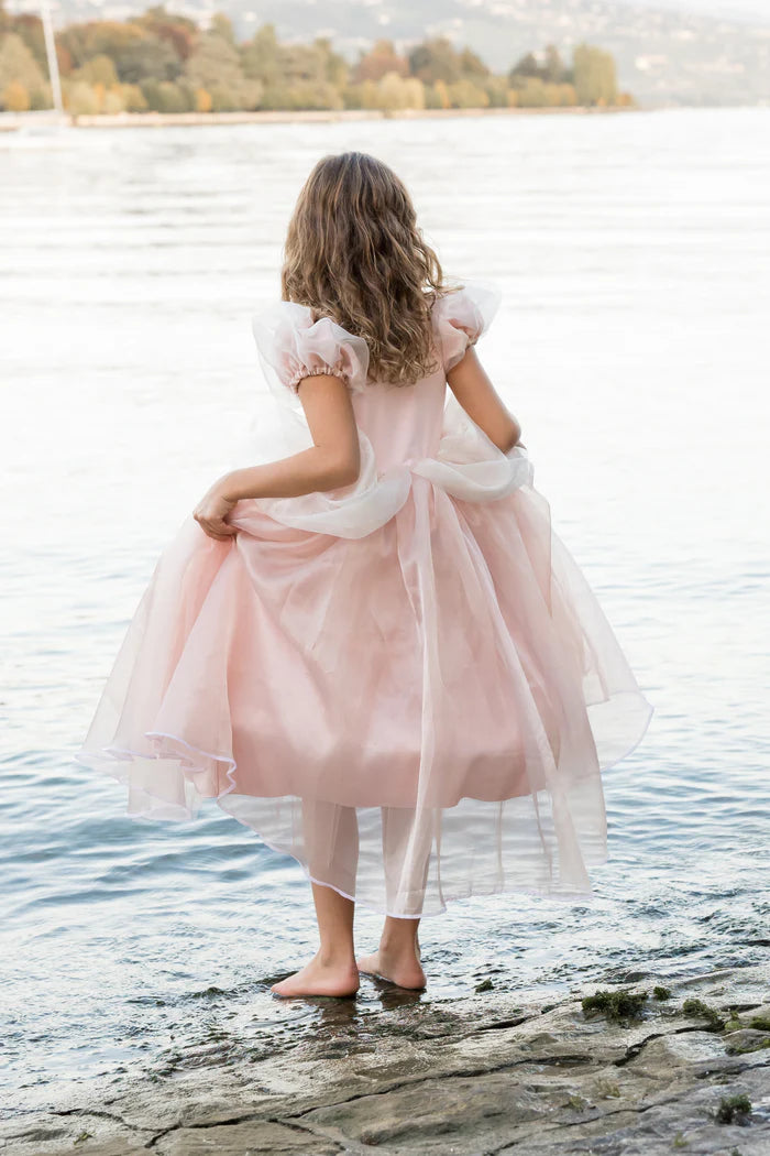 Izrađena od meke i svetlucave taft svile u nežnoj svetlo roze boji, haljina odiše bajkovitom čarolijom. Kratki puf rukavi dodaju dašak kraljevskog šarma, pružajući savršenu meru elegancije za vašu malu princezu. Njihovo lagano lepršanje dodatno pojačava čarobni izgled, omogućavajući detetu da se oseća kao prava princeza – od glave do pete.