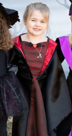Crno-crvena kombinacija boja istovremeno je smela i elegantna. Gornji deo haljine od crvene čipke ima srcoliki izrez i mali detalj šišmiša na grudima. Haljina je duga do poda i izrađena od bogatog tafte koji se prelepo kreće pri hodu, dodajući dramatičan efekat svakom koraku. Upadljiva kragna od crvene tafte sa ojačanjem stoji uspravno, a široki zvonasti rukavi upotpunjuju izgled prave Vampirske Princeze.
