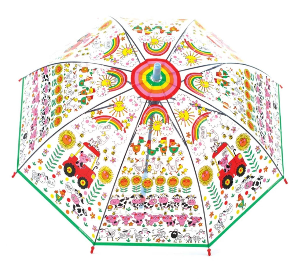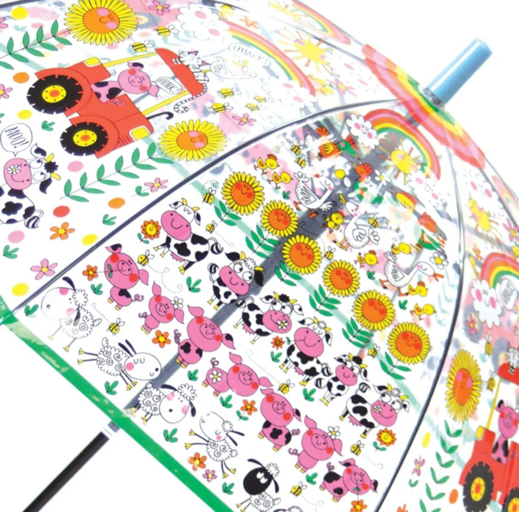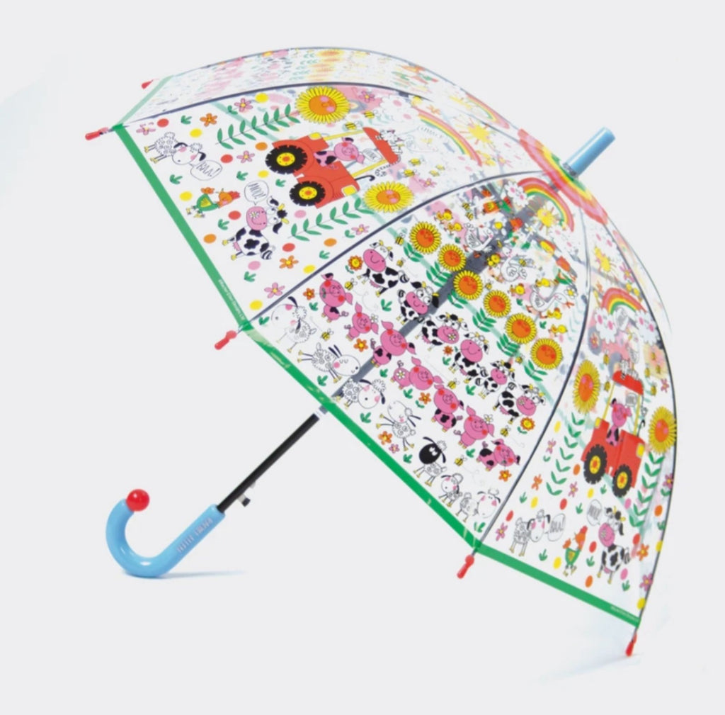 Sigurni smo da će deca obožavati naše Rachel Ellen šarene i prozirne kišobrane, toliko da neće želeti da izađu napolje osim ako ne pada kiša! Kišobrani su pogodni za decu stariju od 5 godina, a metalni okvir i kišobran u obliku kupole daje potpunu pokrivenost glave i ramena. Napravljeni su od ultra-izdržljivog providnog POE materijala, a plastična ručka jarkih boja zasigurno upotpunjuje izgled. Dezen ovog kišrobrana sadrži detalje životinja sa farme.