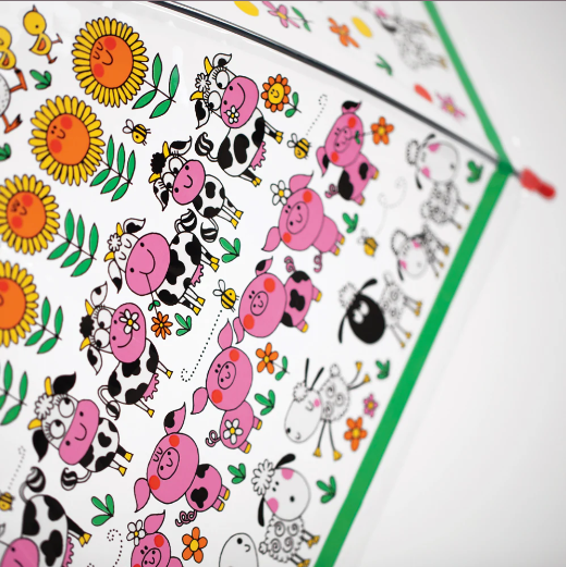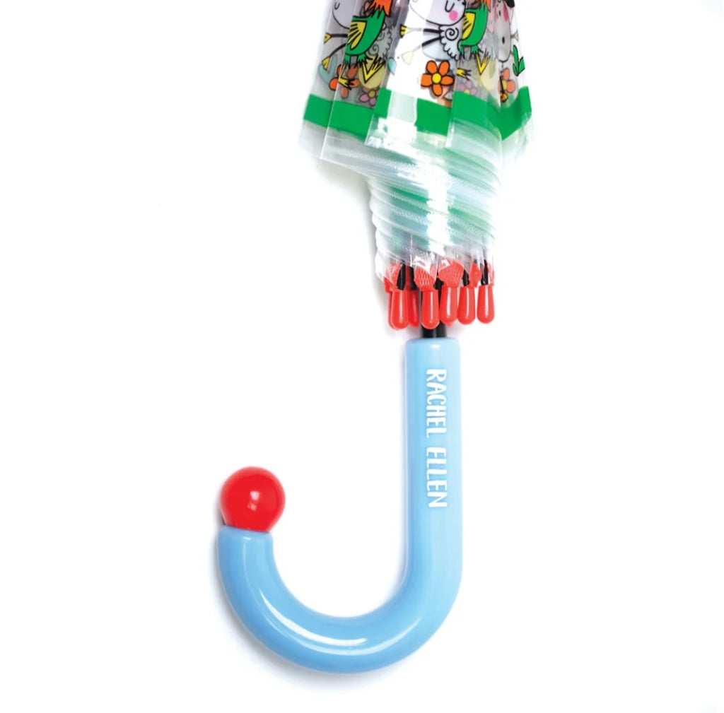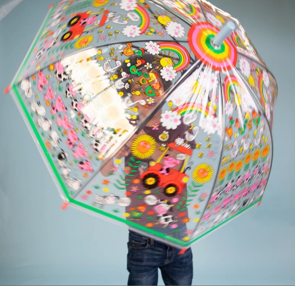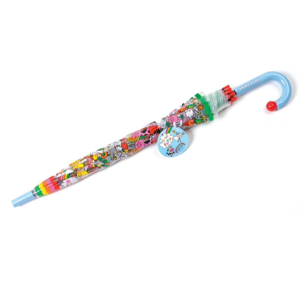 Sigurni smo da će deca obožavati naše Rachel Ellen šarene i prozirne kišobrane, toliko da neće želeti da izađu napolje osim ako ne pada kiša! Kišobrani su pogodni za decu stariju od 5 godina, a metalni okvir i kišobran u obliku kupole daje potpunu pokrivenost glave i ramena. Napravljeni su od ultra-izdržljivog providnog POE materijala, a plastična ručka jarkih boja zasigurno upotpunjuje izgled. Dezen ovog kišrobrana sadrži detalje životinja sa farme.