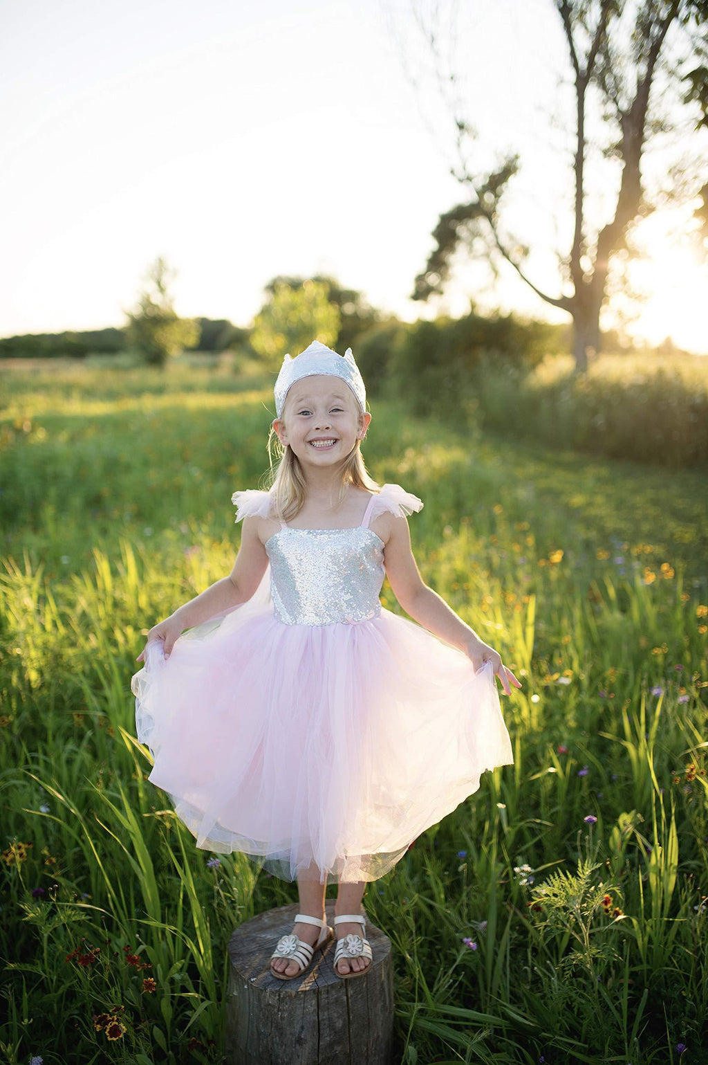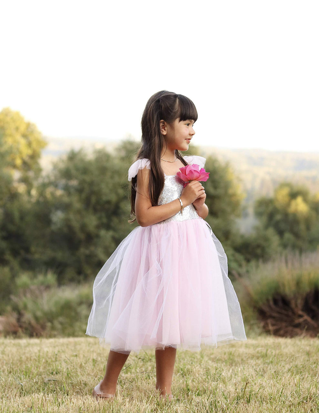 Budite savršena princeza u ovoj blistavoj ružičastoj tutu haljini. Suknja uključuje 2 sloja nežno ružičastog tila i sloj prelivajućeg tila sa šljokicama. Gornji deo je napravljen od prelivajućih šljokica sa mekom rastegljivom spandeks postavom. Bremeni su napravljeni od rastegljivog spandeksa i imaju pufne od tila. Mali detalj sa satenskom mašnom upotpunjuje ovu preslatku princezinu haljinu daškom elegancije.