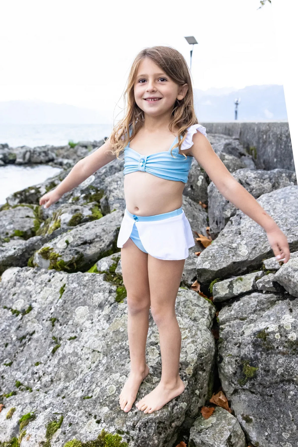 Dodajemo potpuno novu kategoriju u našu ponudu: Princess kupaći kostim! Ovaj očaravajući dvodelni dečiji bikini je pravo ostvarenje bajke. Napravljen je od prelepog plavog spandeks materijala, sa srcolikim izrezom i rukavima sa volanima. Gornji deo je upotpunjen prelepim plavim ukrasom u obliku dragulja na sredini grudi, dok donji deo ima jedinstvenu suknjicu sa odgovarajućim plavim draguljem napred.