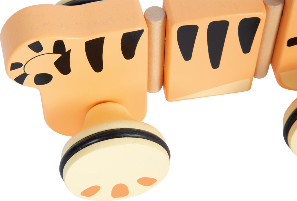 Ovaj pažljivo dizajnirani tigrić na povlačenje, napravljen od 100% FSC® sertifikovanog drveta, savršen je saputnik za prve korake. Njegovo fleksibilno telo sastavljeno iz tri dela prati dete tokom kretanja, podstičući razvoj motorike, koordinacije, kreativnosti i mašte. Tiha gumena točkića nežna su prema podovima i omogućavaju prijatno i stabilno kotrljanje. Sa svojim radoznalim izrazom, veselim dizajnom i visokokvalitetnim printom, tigrić će brzo postati omiljena igračka i pravi ukras svake dečje sobe.