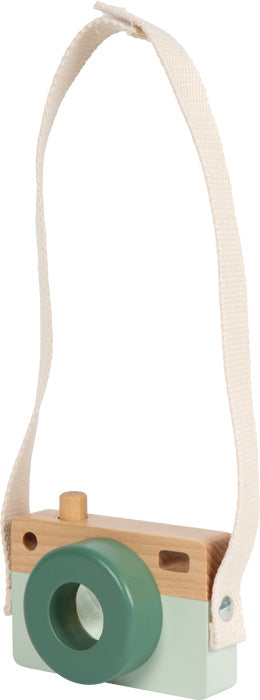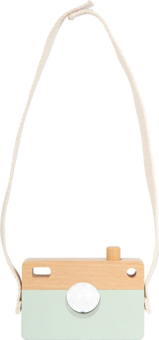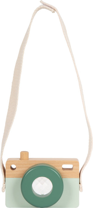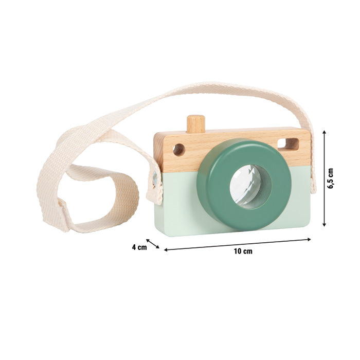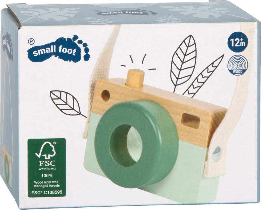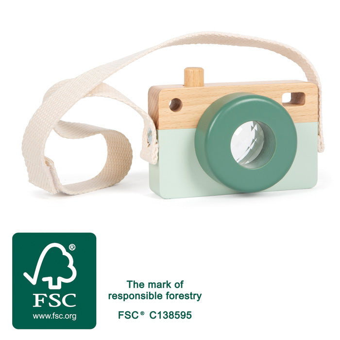 Ova drvena dečja kamera je stilska i maštovita igračka koja će zadiviti mališane: „sočivo” je zapravo kaleidoskop, omogućavajući malim fotografima da otkrivaju šarene šare i zanimljivo izobličene slike dok kroz njega gledaju — uzbudljivo iskustvo za vizuelnu percepciju i imaginaciju. Čvrsto drveno telo kamere modernog izgleda savršeno leži u malim rukama, dok pokretno dugme okidača podstiče spretnost. Uključena tkaninska traka za nošenje sa čičak–zatvaračem omogućava bezbedno i udobno nošenje — idealno za to da kamera uvek bude pri ruci.