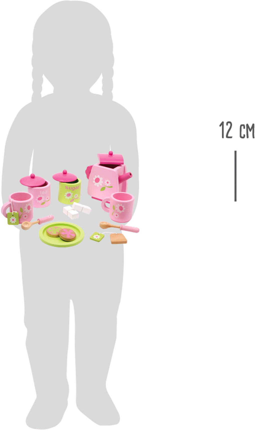 2 kesice čaja, lonac za čaj, činija sa šećerom i šolje sa dizajnom ruža u zelenim bojama stvaraju elegantan sto za čaj! 2 kasičice, 2 vrećice čaja i 2 kocke šećera, kao i tanjir i 2 ukusna keksa upotpunjuju ovaj elegantan drveni set.