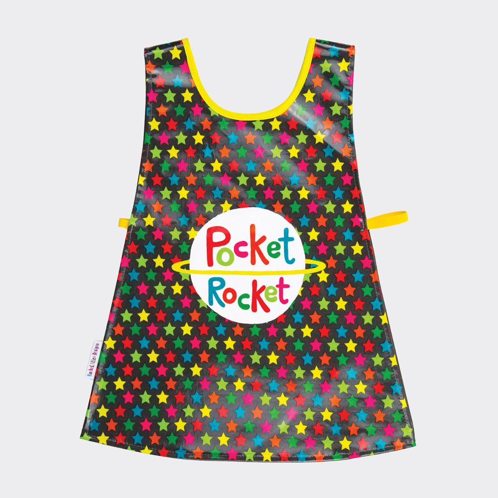 Ova atraktivna dvostrana kecelja savršena je za decu od 2 do 4 godine koji vole kuvanje, slikanje ili uopšteno pravljenje nereda! Ima sjajni premaz, pa se lako briše i elastične trake koje drže prednju i zadnju stranu spojene radi lakšeg skidanja i oblačenja, zajedno s pamučnim okovratnikom. Na prednjoj strani se nalazi raketa velikih dimenzija i planete, dok na zadnjoj strani ima odgovarajući ponavljajući sitniji dezen.