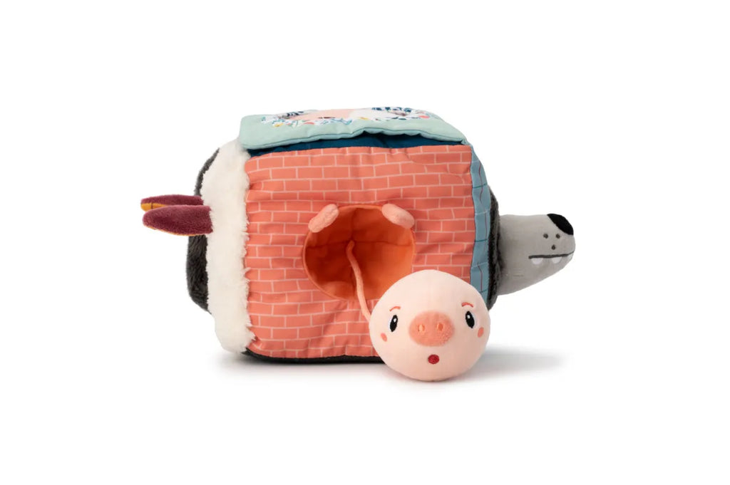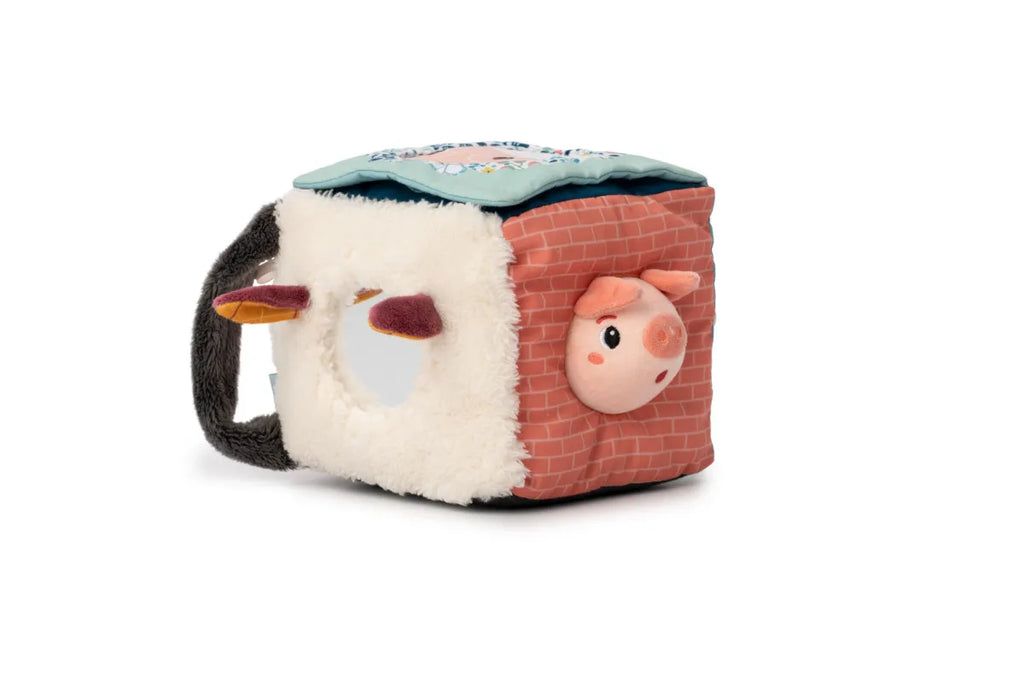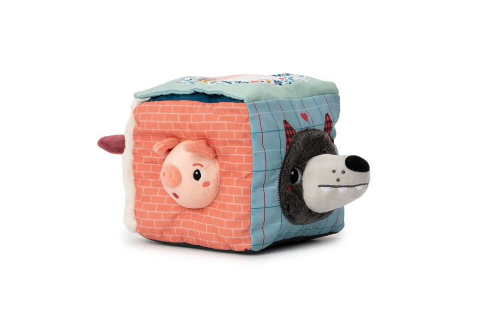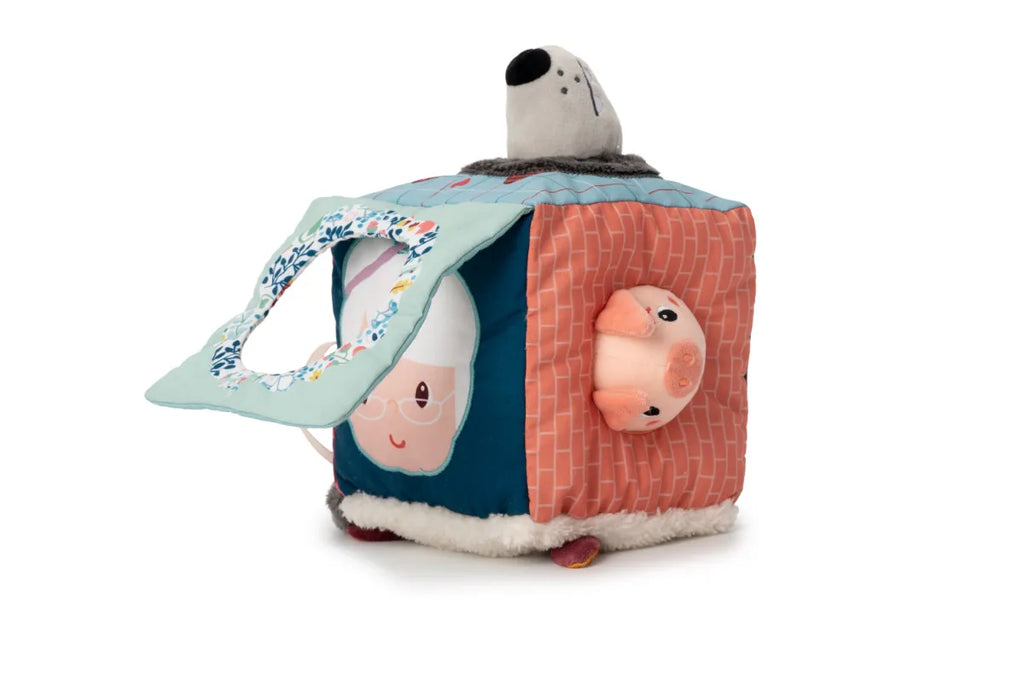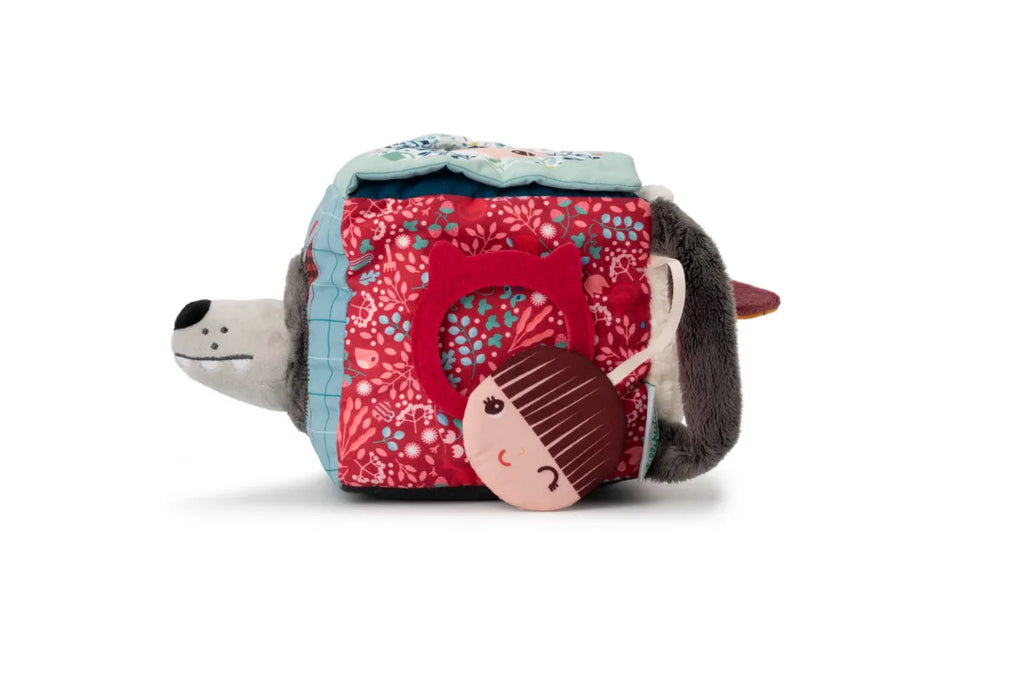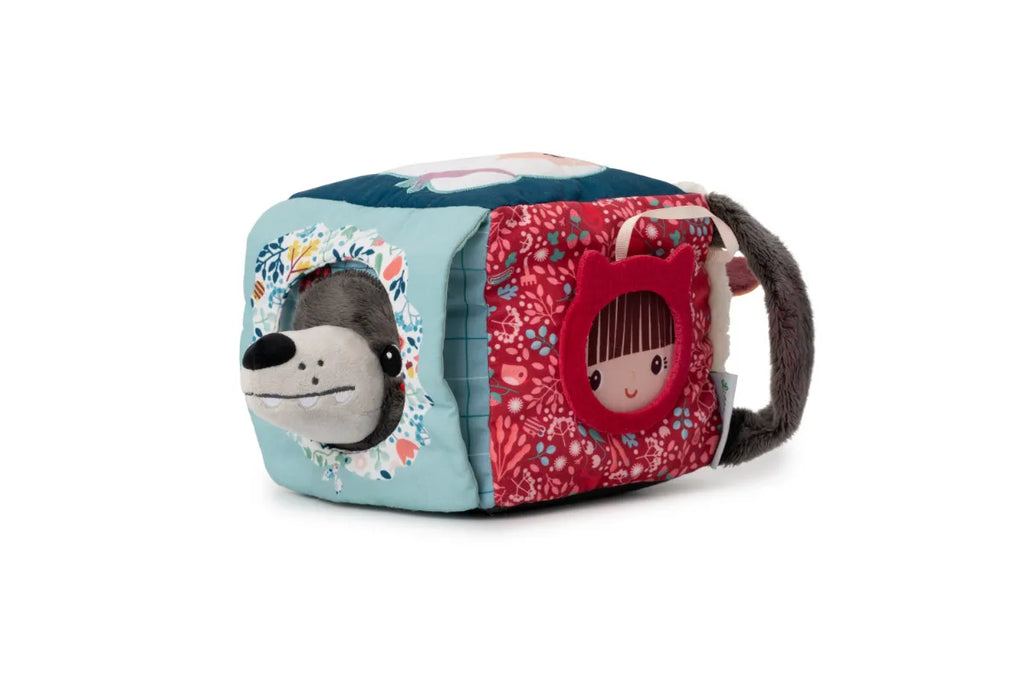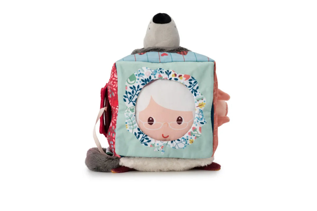 Kocka za aktivnosti Luj Vuk belgijskog brenda Lilliputiens je jedinstven, mekan i multifunkcionalan izvor zabave i učenja za radoznale mališane. Svaka strana sadrži drugačiji lik iz bajke: dvostrani privezak od trake – lice Crvenkape, koje se može postaviti u prozor; okruglo, mekano ogledalo sa ovčijim ušima na pahuljastoj površini; mekanu lopticu nalik prasiću na kanapama, koja se može izvaditi i umetnuti u rupu na kocki; ušiveno bakino lice; i trodimenzionalno plišano lice Luja Vuka – oba lika su povezana mekim zidom sa prozorom kroz koji mogu naizmenično da gledaju napolje. Igračka je napravljena od materijala sa različitim dezenima i teksturama, a takođe ima i dužu, plišanu ručku – hvataljku – i ima mnogo funkcija, uključujući zvonce i pištalicu (aktivira se pritiskom). Čvrsto je napravljena i potpuno bezbedna. Iznenađuje i stimuliše dečju maštu. Razvija koordinaciju oko-ruka, finu motoriku (hvatanje, tresenje, pritiskanje, umetanje, izvlačenje), aktivira čulo sluha, vida i dodira. Možete upariti ovu igračku sa drugima sa istim junakom. Savršena kao poklon. serija: multifunkcionalne razvojne igračke