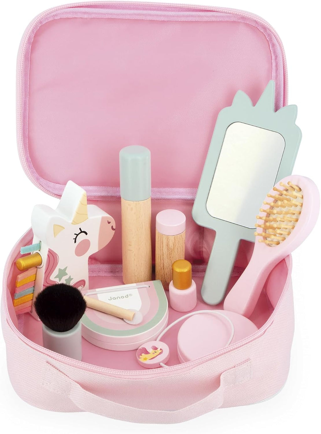 Ovaj drveni set sa 10 dodataka podstiče kreativnost i igru dece starije od 3 godine, dok kroz zabavu uče da brinu o sebi i drugima.Svi dodaci mogu se uredno spakovati u torbicu sa rajsferšlusom, savršenu za igru kod kuće ili u pokretu.
