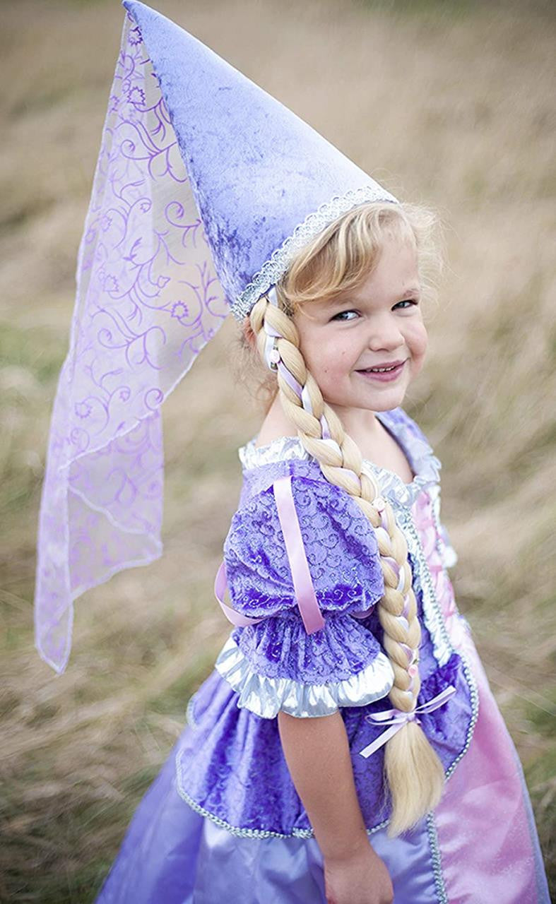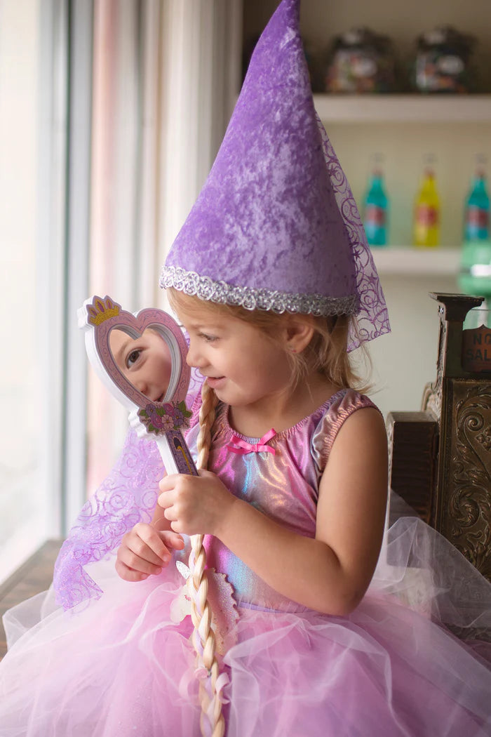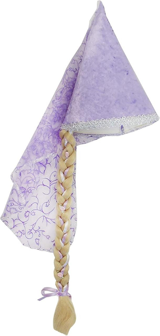 Naš šešir sa motivom Zlatokose dolazi sa dugačkom plavom pletenicom sa trakom i cvećem. Šešir od velura u lila boji ukrašen je srebrnim detaljima i ima lep dugačak rep od tila sa šljokicama.
