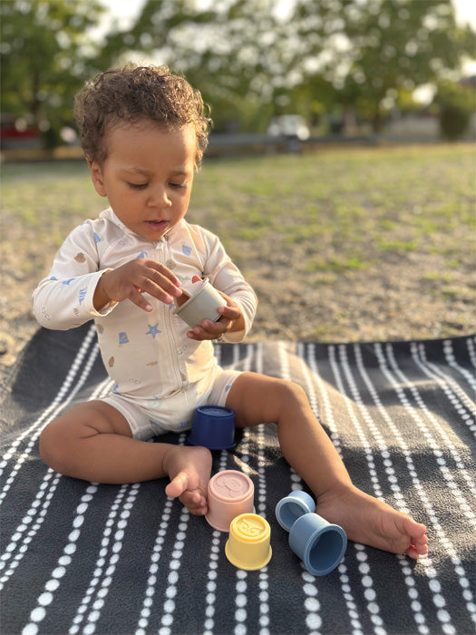 Ove 7-delne, ljupko dizajnirane čaše za slaganje unose zabavu u dečiju sobu, kadu ili pesak. Sa slatkim motivima životinja na vrhu svake čaše, različite veličine pozivaju mališane da treniraju finu motoriku, prave prve pokušaje slaganja i otkrivaju svet svim svojim čulima.