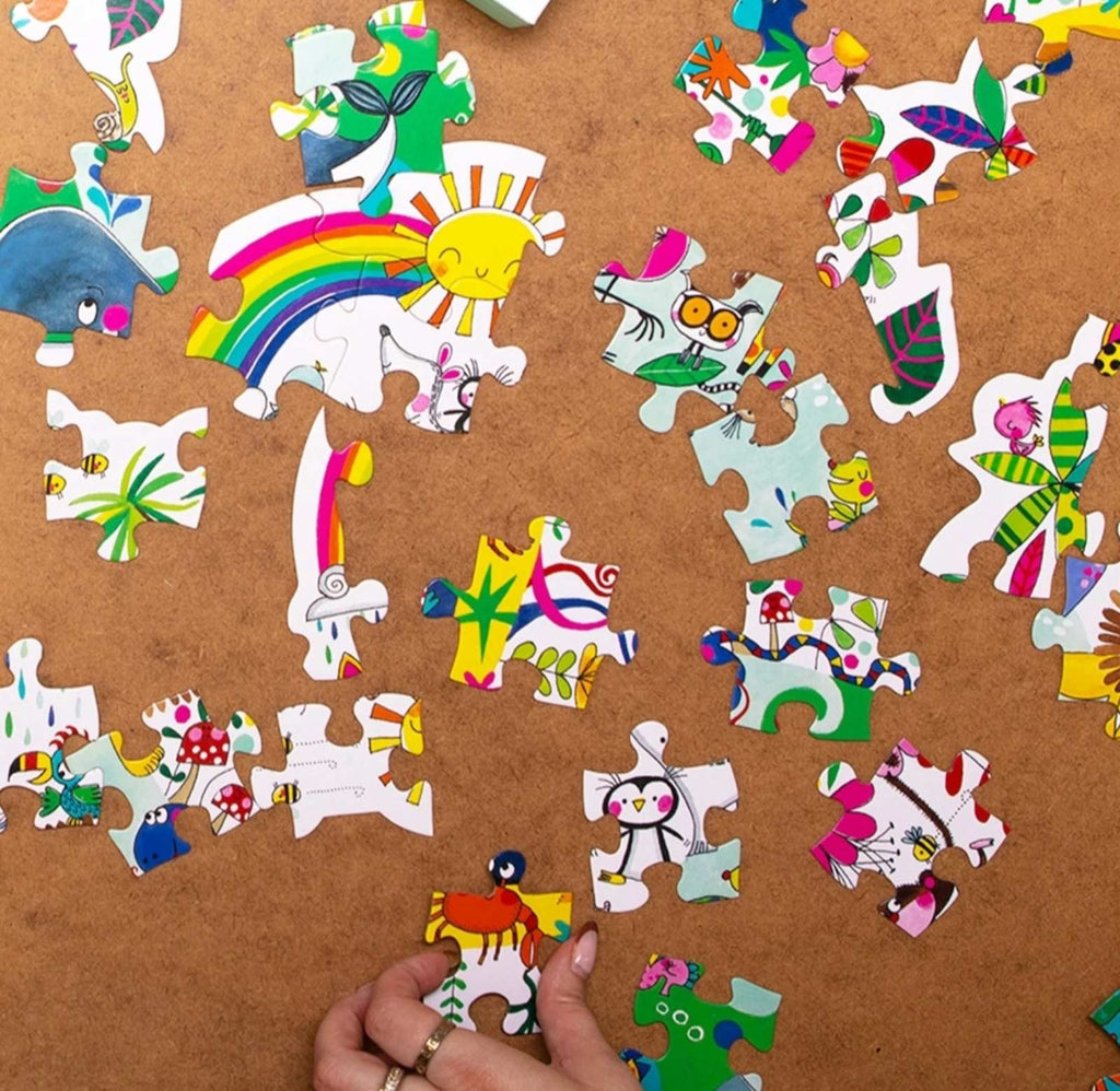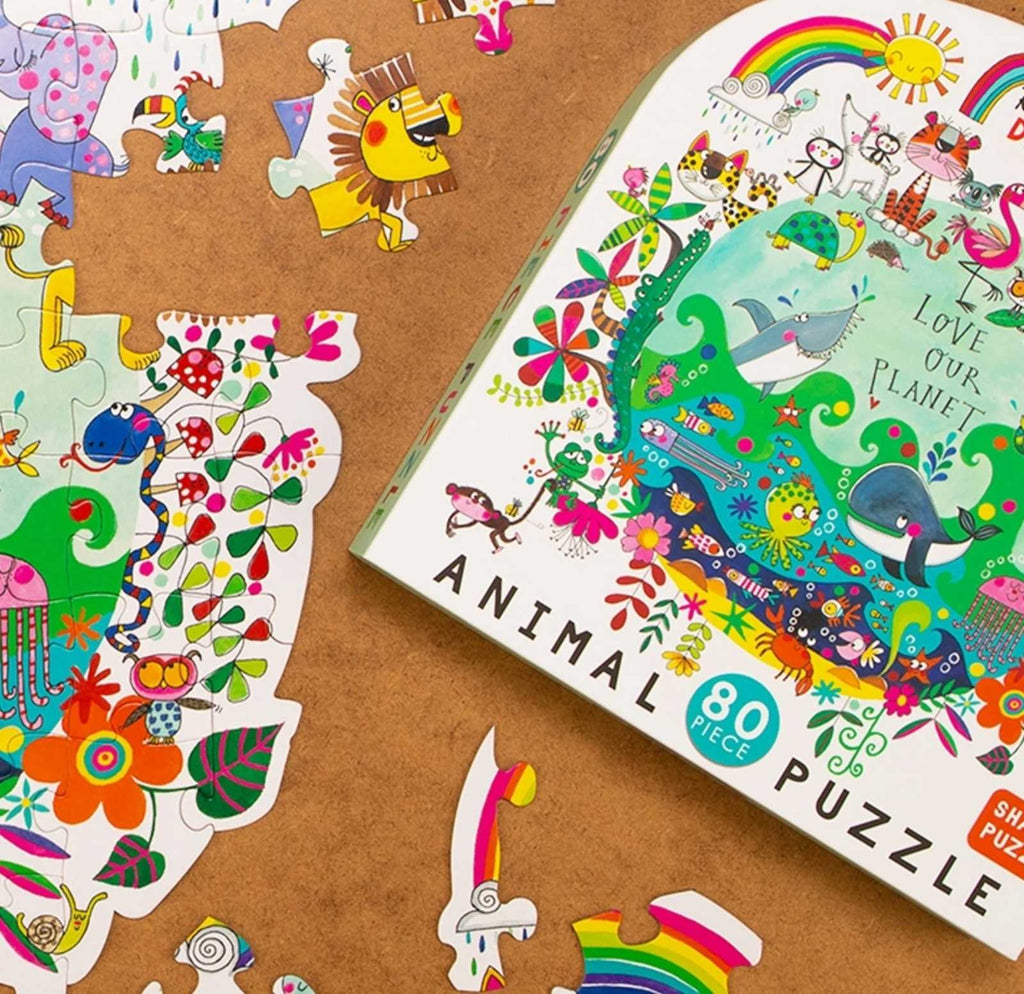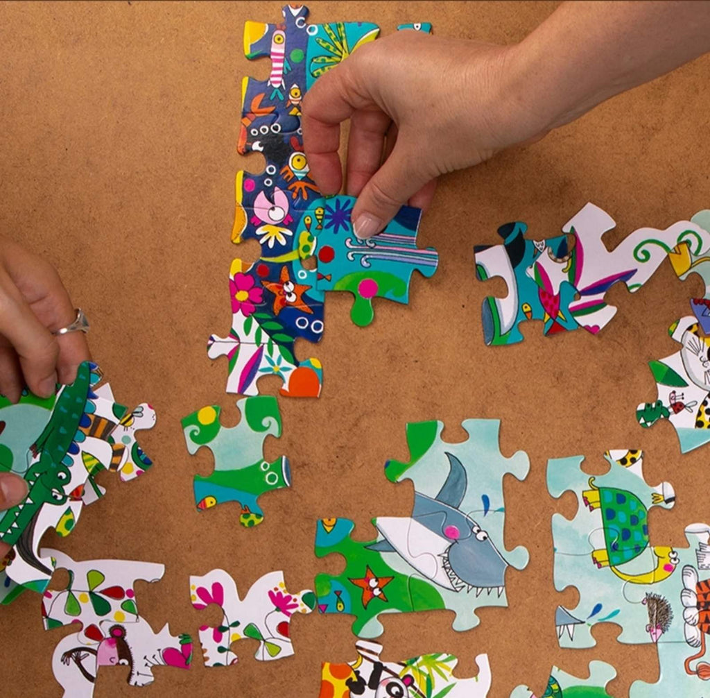 Nova, živopisna slagalica u dizajnu sa motivima iz životinjskog carstva. Prikazuje žirafu, lava, tigra, flaminga, kita, slonove, leoparde i još mnogo toga! Pakovana u čvrstu kutiju sa odštampanim prikazom slagalice unutra, koja sadrži 80 delova.