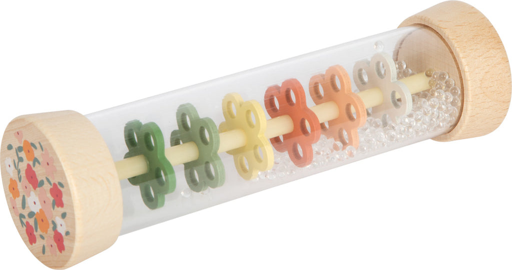 Zvuk prolećne kiše! Ovaj „kišoprav“ (rainmaker) spaja nežne zvuke sa pažljivo osmišljenim dizajnom, stvarajući višesenzorno iskustvo za male istraživače. Bilo da se koristi kao umirujuća zvučna igračka, prvi ritmički instrument ili šarena zvečka – providna plastična kugla otkriva svetlucave perlice koje se slivaju kroz šarene, perforirane pločice u obliku cveća. Zanimljiva igra za oči i uši koja će oduševiti i bebe i malu decu!