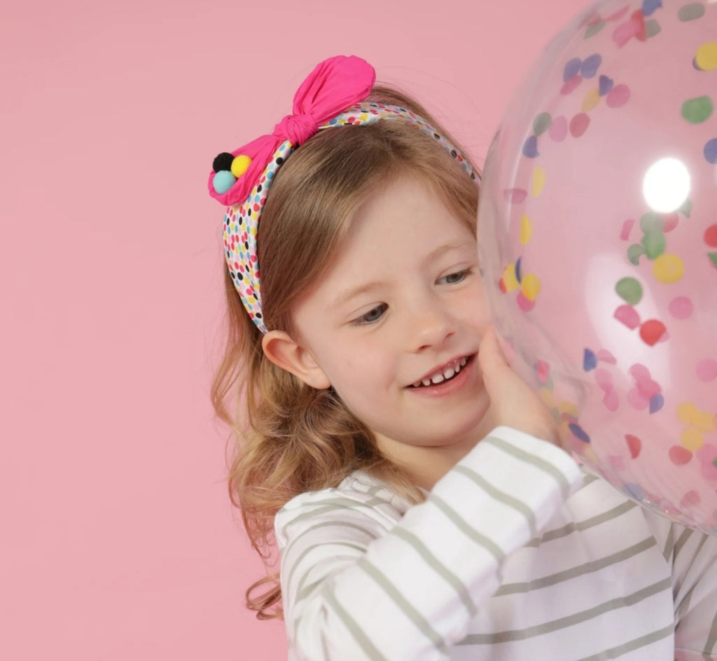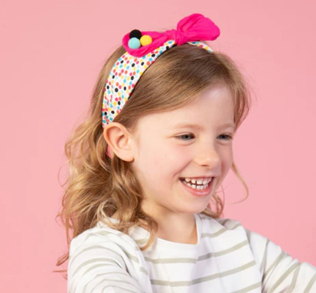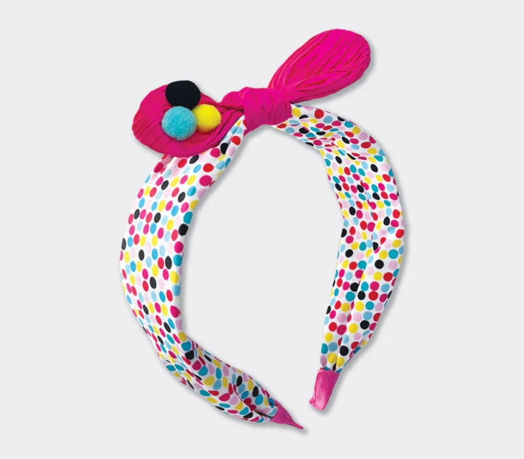 Ova prelepa traka za glavu će dodati dašak boje svakoj odeći! Sa belom trakom ukrašenom živopisnim višebojnim tačkastim uzorkom, na vrhu je ručno vezana ružičasta mašna i ukrašena je teget, ružičastim i žutim ukrasima sa pomponima. Veoma zabavna i svetla, ova traka za glavu je dizajnirana da pruži udobnost deci uzrasta od 3 do 10 godina.