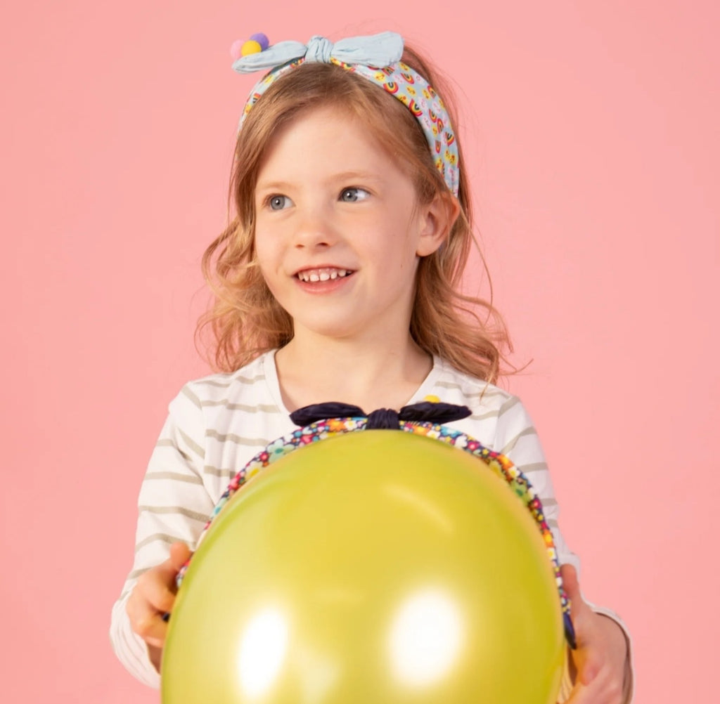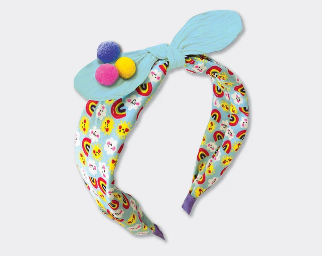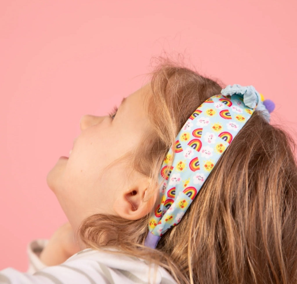 Unesite veselo sunčano nebo u svaku odeću uz ovu prelepu traku za glavu sa suncem, dugama i oblacima! Sa svetloplavom trakom sa šarom divnih sunca, duga i oblaka, završena je ručno vezanom svetloplavom mašnom. Ova traka za glavu je ukrašena raznobojnim ukrasima od pompona i zelenim polumesecom. Veoma zabavna i svetla, dizajnirana je da pruži udobnost deci uzrasta od 3 do 10 godina.