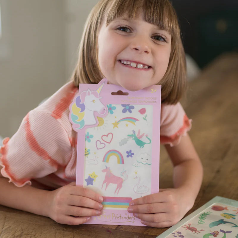 Ovaj set privremenih tetovaža sadrži duge, jednoroge i sva magična stvorenja napravljena sa šljokicama koje se prelepo reflektuju na suncu! Naše privremene tetovaže mogu se naneti kao klasične privremene tetovaže. Uputstvo se nalazi na poleđini.