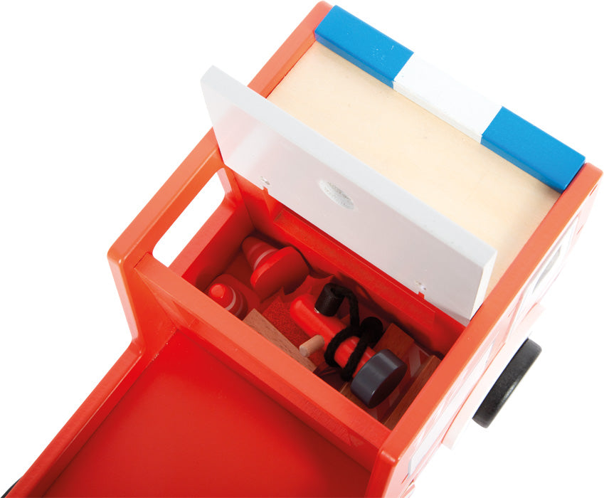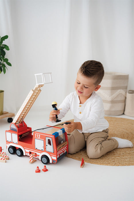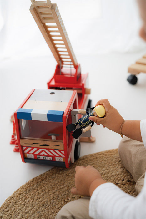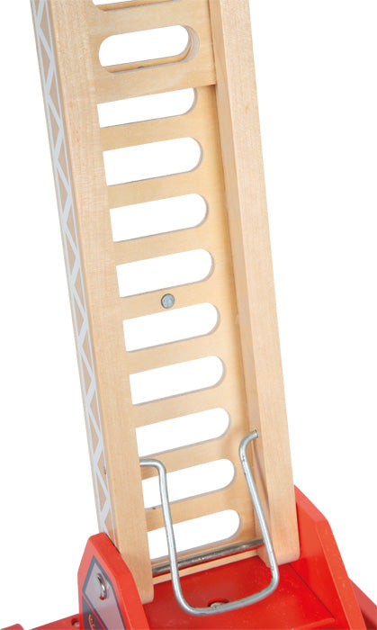 Kada stigne hitan poziv, ovaj drveni vatrogasni kamion je na licu mesta u tren oka! Ovo izuzetno veliko vozilo za hitne intervencije ne impresionira samo dobro osmišljenim detaljima i robusnom izradom, već i produživim merdevinama sa korpom koje se mogu rotirati za 360 stepeni, što omogućava operacije spasavanja na velikim visinama. Merdevine se sigurno zaključavaju u položaju zahvaljujući magnetu.