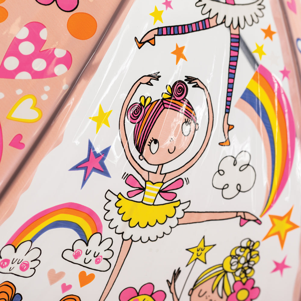 Sigurni smo da će deca obožavati naše Rachel Ellen šarene i prozirne kišobrane, toliko da neće želeti da izađu napolje osim ako ne pada kiša! Kišobrani su pogodni za decu stariju od 5 godina, a metalni okvir i kišobran u obliku kupole daje potpunu pokrivenost glave i ramena. Napravljeni su od ultra-izdržljivog providnog POE materijala, a plastična ručka jarkih boja zasigurno upotpunjuje izgled. Dezen ovog kišrobrana sadrži mnogobrojne balerine, kao i duge i sunca.
