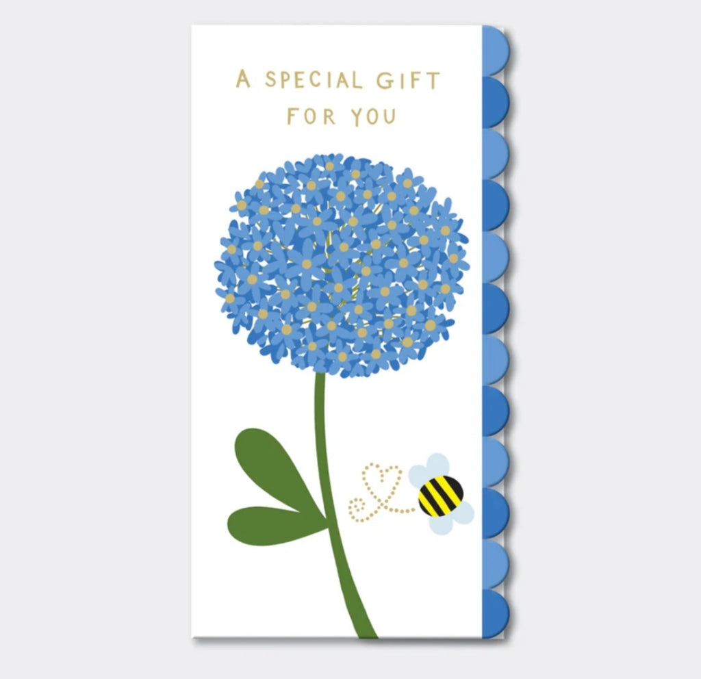 Ova kartica-novčanik ima prelep ručno oslikan dizajn pčele i plavog cveta alijum uz poruku „Poseban poklon za vas“, sa belom kovertom. Posebno je dizajnirana za držanje novčanica ili poklon vaučera, što je čini idealnim poklonom za svaku priliku. Odštampana je u živim bojama na teksturiranom kartonu i izrezana je sa lepim školjkastim ivicama.